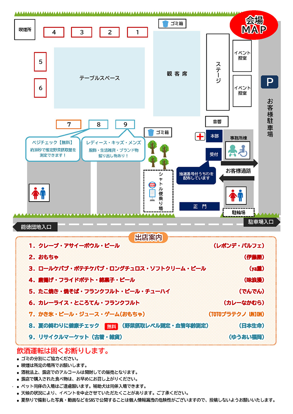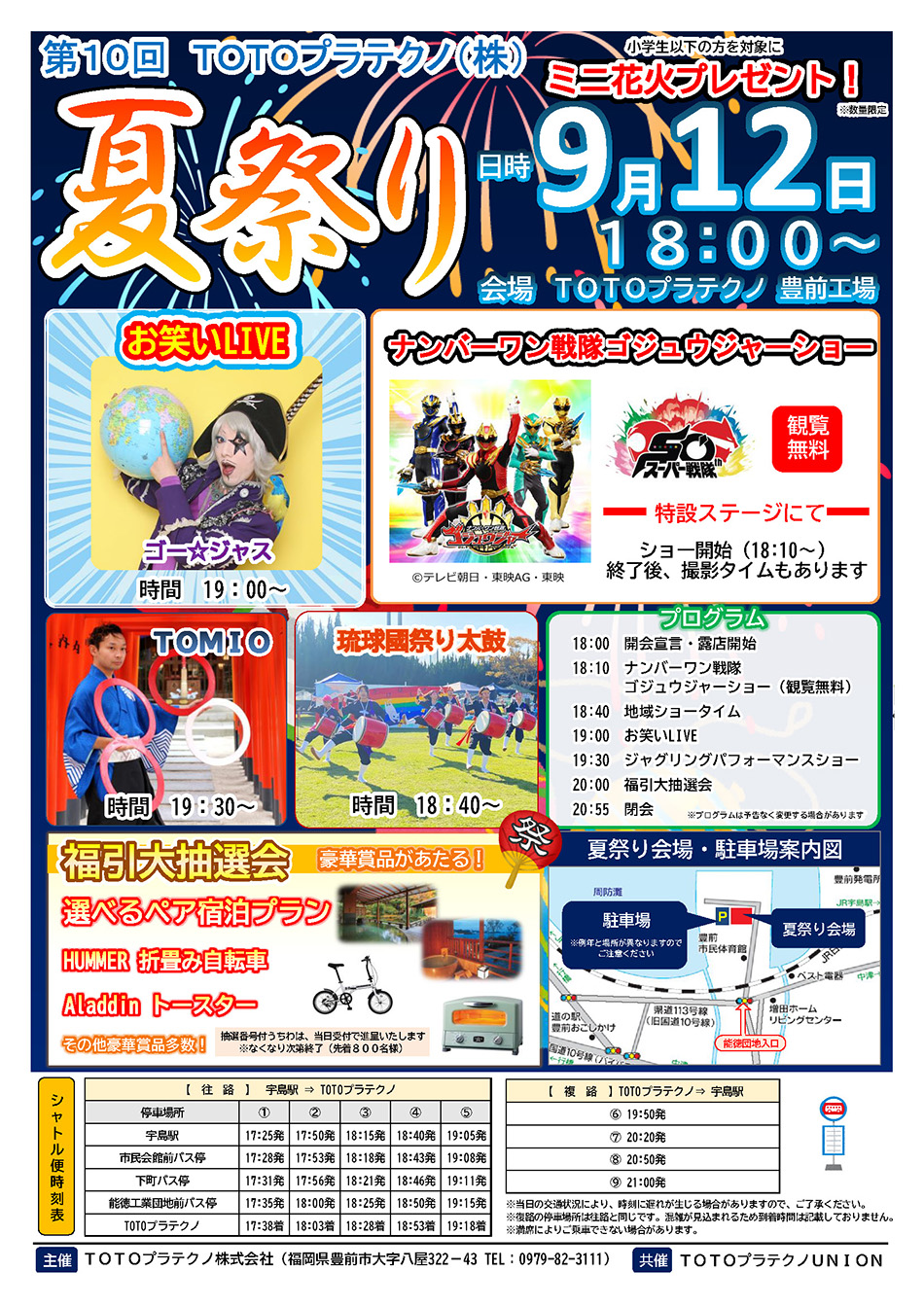 2025年度 TOTOプラテクノ夏祭り開催についてお知らせいたします。 【日時】 9月12日(金)18:00~20:55※少雨決行 【場所】 TOTOプラテクノ豊前工場 ※駐車場はTOTOプラテクノ構内駐車場(チラシ参照)をご利用ください。 ※当日はJR宇島駅から夏祭り会場まで無料シャトルタクシーを運行します。 【内容】 ステージイベント、飲食店出店、福引き大抽選会など ※詳細は下記チラシをクリックしてください。 お知らせカテゴリー トピックス